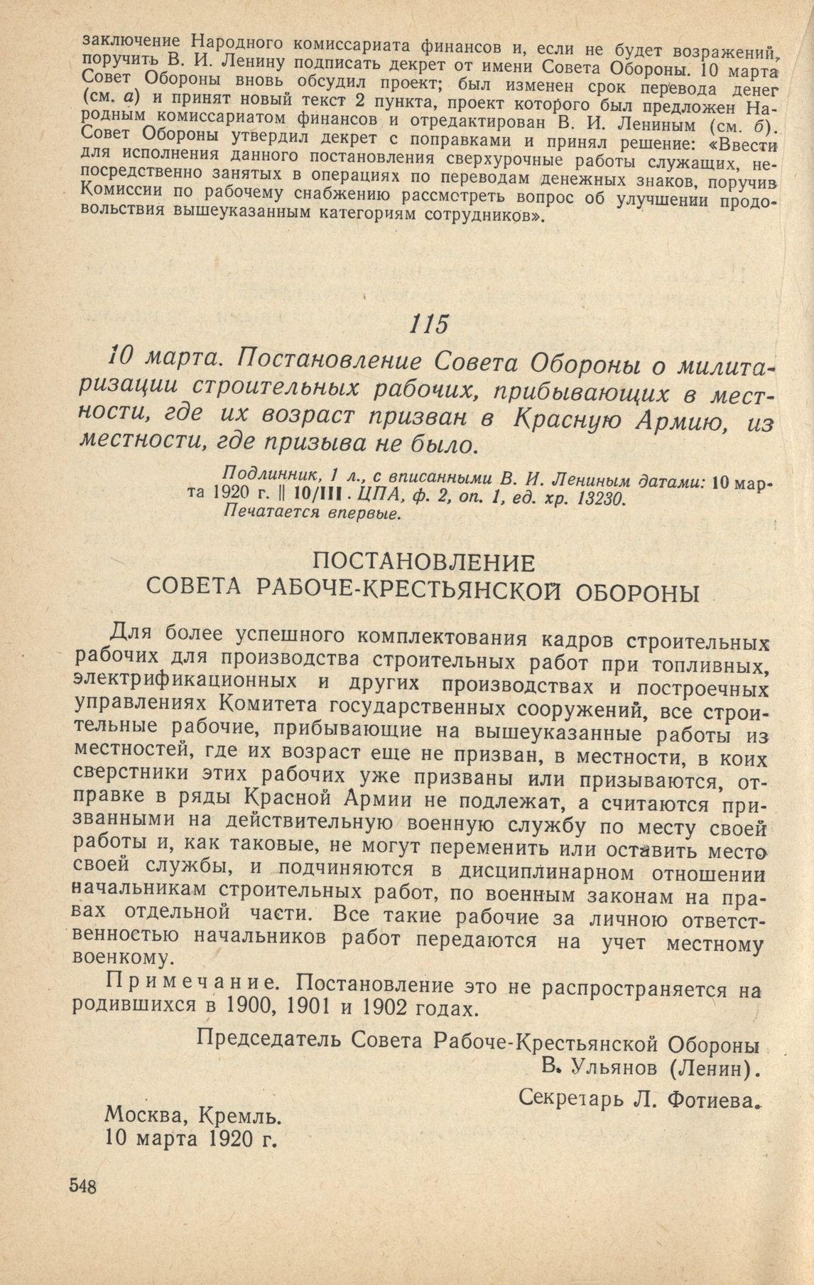 Главная Серия «Экономическая история. Документы, исследования, переводы» Декреты советской власти в 18 т. Декреты Советской власти. Т. VII. 10 декабря 1919 г. – 31 марта 192... Документы 10 марта. Постановление Совета Обороны о милитаризации строительных...