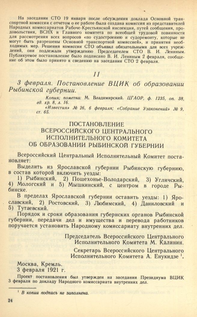 3 февраля. Постановление ВЦИК об образовании Рыбинской губернии // Копия; пометка: М. Владимирский, ЦГАОР, ф. 1235, оп. 38, ед. хр. 8, л. 16. «Известия» № 26, 6 февраля; «Собрание Узаконений» № 9, ст. 65.