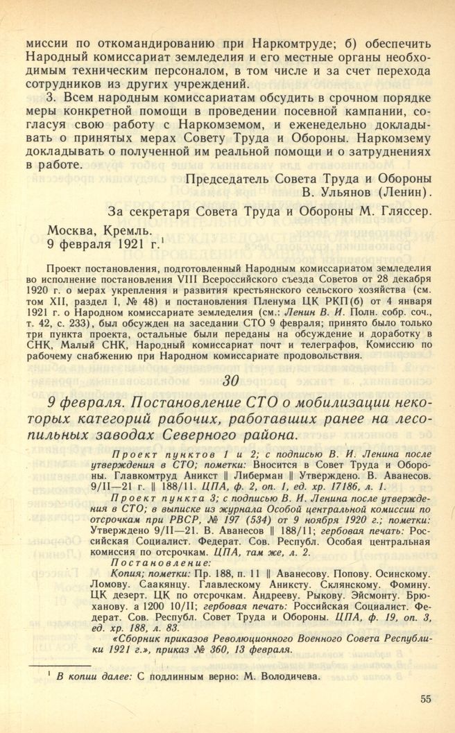 9 февраля. Постановление СТО о мобилизации некоторых категорий рабочих, работавших ранее на лесопильных заводах Северного района // Проект пунктов 1 и 2; с подписью В. И. Ленина после утверждения в СТО; пометки: Вносится в Совет Труда и Обороны. Главкомтруд Аникст || Либерман || Утверждено. В. Аванесов. 9/II — 21 г. || 188/11. ЦПА. ф. 2, оп. 1, ед. хр. 17186, л. 1. Проект пункта 3; с подписью В. И. Ленина после утверждения в СТО; в выписке из журнала Особой центральной комиссии по отсрочкам при РВСР, № 197 (534) от 9 ноября 1920 г.; пометки: Утверждено 9/II —21. В. Аванесов || 188/11; гербовая печать: Российская Социалист. Федерат. Сов. Республ. Особая центральная комиссия по отсрочкам. ЦПА, там же, л. 2. Постановление: Копия; пометки: Пр. 188, п. 11 || Аванесову. Попову. Осинскому. Ломову. Саакянцу. Главлескому Аниксту. Склянскому. Фомину. ЦК дезерт. ЦК по отсрочкам. Андрееву. Рыкову. Эйсмонту. Брюханову. а 1200 10/II; гербовая печать: Российская Социалист. Федерат. Сов. Республ. Совет Труда и Обороны. ЦПА, ф. 19, оп. 3, ед. хр. 188, л. 83. «Сборник приказов Революционного Военного Совета Республики 1921 г.», приказ № 360, 13 февраля.