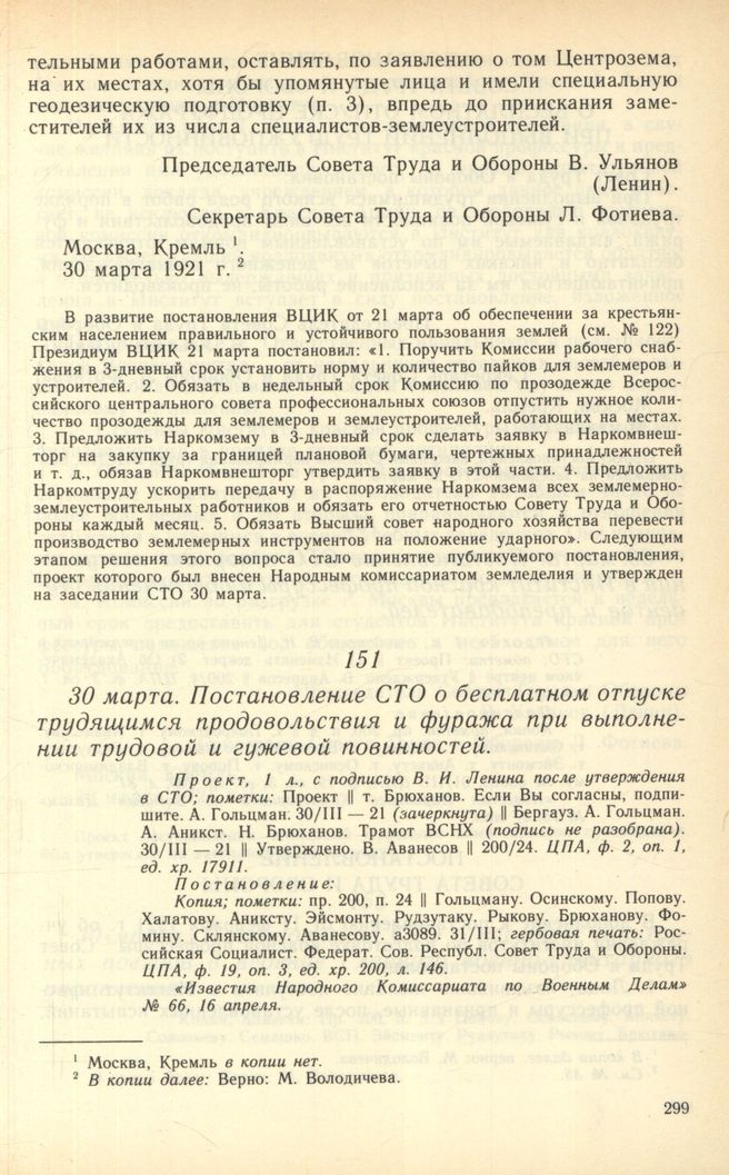 30 марта. Постановление СТО о бесплатном отпуске трудящимся продовольствия и фуража при выполнении трудовой и гужевой повинностей // Проект, 1 л., с подписью В. И. Ленина после утверждения в СТО; пометки: Проект || т. Брюханов. Если Вы согласны, подпишите. А. Гольцман. 30/III — 21 (зачеркнута) || Бергауз. А. Гольцман. А. Аникст. Н. Брюханов. Трамот ВСНХ (подпись не разобрана). 30/III — 21 || Утверждено. В. Аванесов || 200/24. ЦПА, ф. 2, оп. 1, ед. хр. 17911. Постановление: Копия; пометки: пр. 200, п. 24 || Больцману. Осинскому. Попову. Халатову. Аниксту. Эйсмонту. Рудзутаку. Рыкову. Брюханову. Фомину. Склянскому. Аванесову. а3089. 31/III; гербовая печать: Российская Социалист. Федерат. Сов. Республ. Совет Труда и Обороны. ЦПА, ф. 19, оп. 3, ед. хр. 200, л. 146. «Известия Народного Комиссариата по Военным Делам» № 66, 16 апреля.