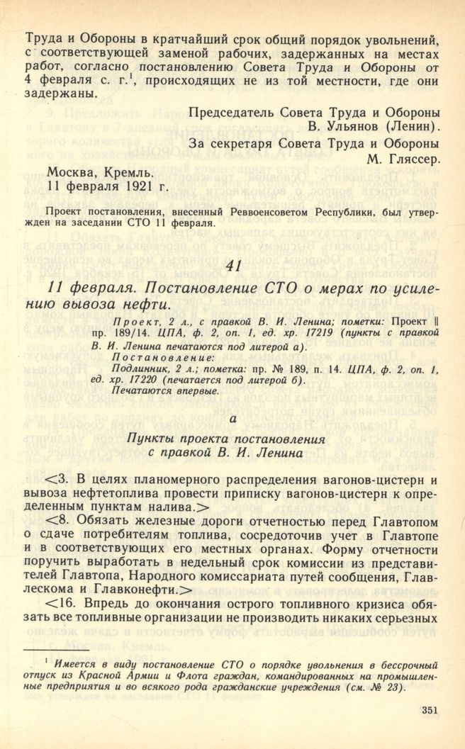 11 февраля. Постановление СТО о мерах по усилению вывоза нефти // Проект, 2 л., с правкой В. И. Ленина; пометки: Проект || пр. 189/14. ЦПА, ф. 2, оп. 1, ед. хр. 17219 (пункты с правкой В. И. Ленина печатаются под литерой а). Постановление: Подлинник, 2 л.; пометка: пр. № 189, п. 14. ЦПА, ф. 2, оп. 1, ед. хр. 17220 (печатается под литерой б). Печатаются впервые.