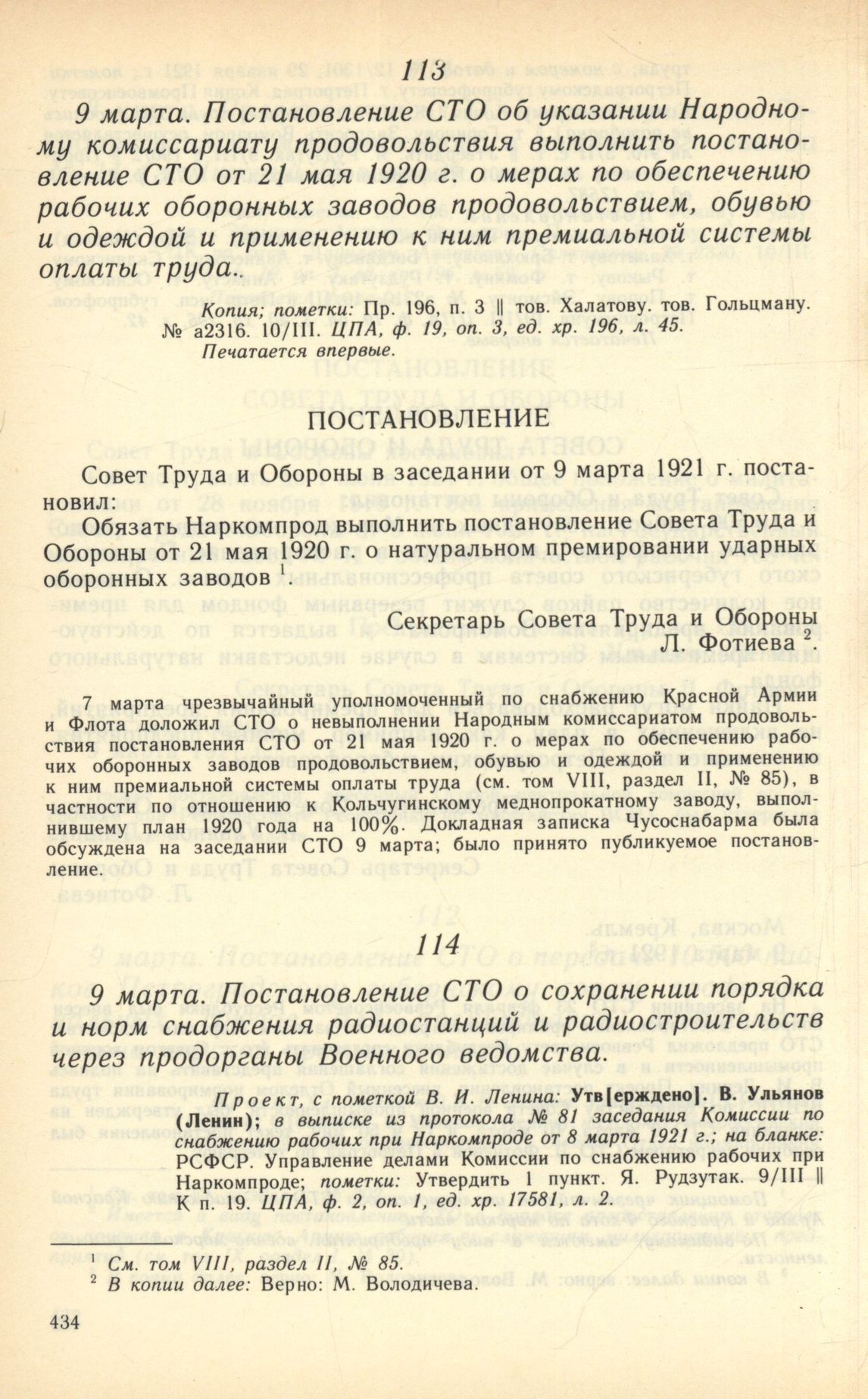 9 марта. Постановление СТО о сохранении порядка и норм снабжения радиостанций и радиостроительств через продорганы Военного ведомства // Проект, с пометкой В. И. Ленина: Утв[ерждено]. В. Ульянов (Ленин); в выписке из протокола № 81 заседания Комиссии по снабжению рабочих при Наркомпроде от 8 марта 1921 г.; на бланке: РСФСР. Управление делами Комиссии по снабжению рабочих при Наркомпроде; пометки: Утвердить 1 пункт. Я. Рудзутак. 9/III || К п. 19. ЦПА, ф. 2, оп. 1, ед. хр. 17581, л. 2. Постановление: Копия; пометки: Пр. 96 п. 19 || а2327. 14/III 21 г. || т. Н. П. Горбунову; гербовая печать: Российская Социалист. Федерат. Сов. Республ. Совет Труда и Обороны. ЦПА, там же, л. 1. Печатается впервые.