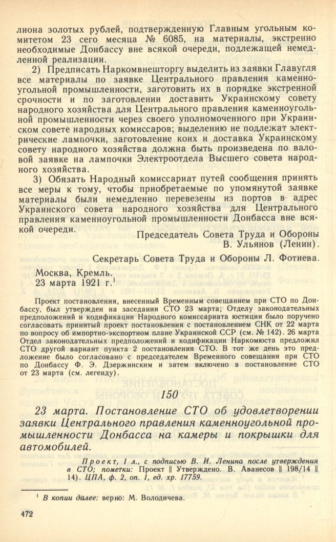 23 марта. Постановление СТО об удовлетворении заявки Центрального правления каменноугольной промышленности Донбасса на камеры и покрышки для автомобилей // Проект, 1 л., с подписью В. И. Ленина после утверждения в СТО ; пометки: Проект || Утверждено. В. Аванесов || 198/14 || 14). ЦПА, ф. 2, оп. 1, ед. хр. 17759. Постановление: Копия; пометки: пр. 198, п. 14 || Ломову. Аванесову. Склянскому. Брюханову. Фомину. Осинскому. Рудзутаку. Рыкову. Аниксту. Попову. Эйсмонту. Дзержинскому. Главуголь. а2756. 24/III. ЦПА, ф. 19, оп. 3, ед. хр. 198, л. 100. Печатается впервые.