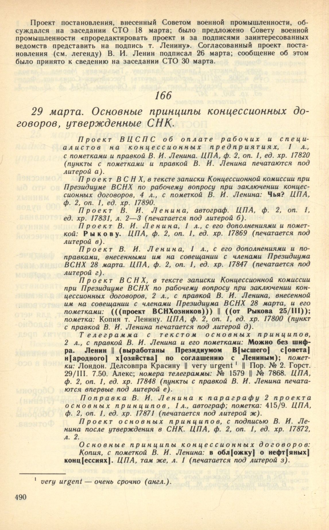 | Библиографическое описание | 29 марта. Основные принципы концессионных договоров, утвержденные СНК // Проект ВЦСПС об оплате рабочих и специалистов на концессионных предприятиях, 1 л., с пометками и правкой В. И. Ленина. ЦПА, ф. 2, оп. 1, ед. хр. 17820 (пункты с пометками и правкой В. И. Ленина печатаются под литерой а). Проект ВСНX, в тексте записки Концессионной комиссии при Президиуме ВСНХ по рабочему вопросу при заключении концессионных договоров, 4 л., с пометкой В. И. Ленина: Чья? ЦПА, ф. 2, оп. 1, ед. хр. 17890. Проект В. И. Ленина, автограф. ЦПА, ф. 2, оп. 1, ед. хр. 17831, л. 2—3 (печатается под литерой б). Проект В. И. Ленина, 1 л., с его дополнениями и пометкой: Рыкову. ЦПА, ф. 2, оп. 1, ед. хр. 17869 (печатается под литерой в). Проект В. И. Ленина, 1 л., с его дополнениями и поправками, внесенными им на совещании с членами Президиума ВСНХ 28 марта. ЦПА, ф. 2, оп. 1, ед. хр. 17847 (печатается под литерой г). Проект ВСНХ, в тексте записки Концессионной комиссии при Президиуме ВСНХ по рабочему вопросу при заключении концессионных договоров, 2 л., с правкой В. И. Ленина, внесенной им на совещании с членами Президиума ВСНХ 28 марта, и его пометками: (((проект ВСНХозников))) || ((от Рыкова 25/III)); пометка: Копия т. Ленину. ЦПА, ф. 2, оп. 1, ед. хр. 17800 (пункт с правкой В. И. Ленина печатается под литерой д). Телеграмма с текстом основных принципов, 2 л., с правкой В. И. Ленина и его пометками: Можно без шифра. Ленин || (выработаны Президиумом В[ысшего] С[овета] Н[ародного] Х[озяйства] по соглашению с Лениным); пометки: Лондон. Делсовпра Красину || very urgent || Пор. № 2. Горст. 29/III. 7.50. Алекс; номера телеграммы: № 1579 || № 7868. ЦПА, ф. 2, оп. 1, ед. хр. 17848 (пункты с правкой В. И. Ленина печатаются впервые под литерой е). Поправка В. И. Ленина к параграфу 2 проекта основных принципов, 1 л., автограф: пометка: 415/9. ЦПА, ф. 2, оп. 1, ед. хр. 17871 (печатается под литерой ж). Проект основных принципов, с подписью В. И. Ленина после утверждения в СНК. ЦПА, ф. 2, оп. 1, ед. хр. 17872, л. 2. Основные принципы концессионных договоров: Копия, с пометкой В. И. Ленина: в обл[ожку] о нефт[яных] конц[ессиях]. ЦПА, там же, л. 1 (печатается под литерой з). |