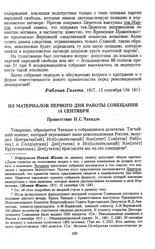 Главная Серия «Политические партии России. Конец XIX – первая треть ХХ века... Меньшевики в 1903—1931 гг. Меньшевики в 1917 году. В 3 т. Т. 3. От корниловского мятежа до кон... Документы Из материалов первого дня работы Совещания 14 сентября. Приветствие...