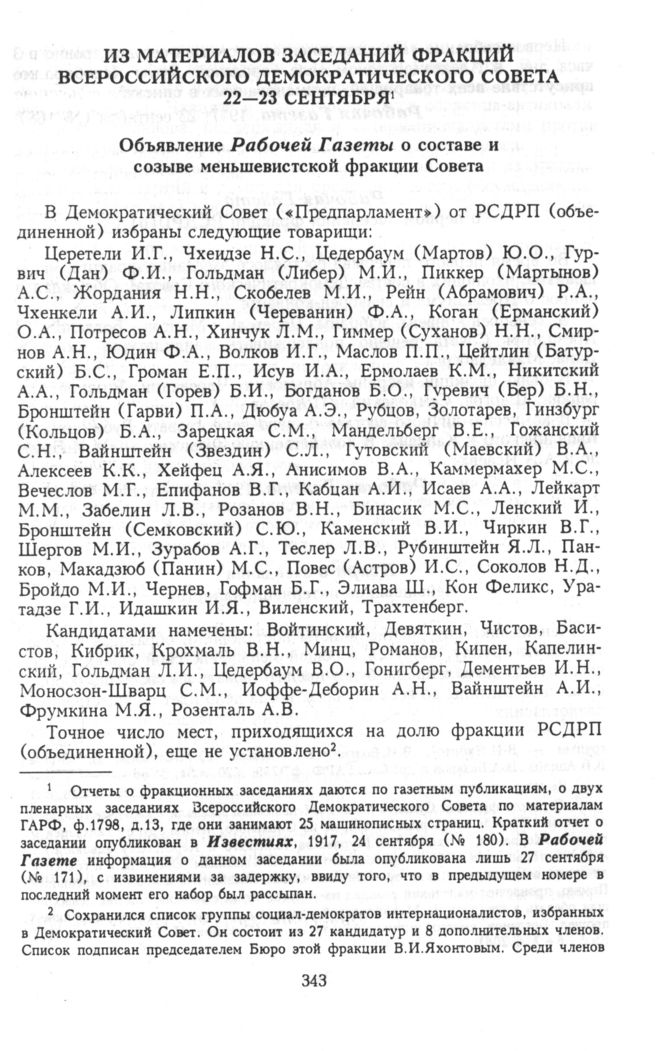 Из материалов Всероссийского Демократического Совета 22 — 23 сентября. Объявление Рабочей Газеты о составе и созыве меньшевистской фракции Совета
