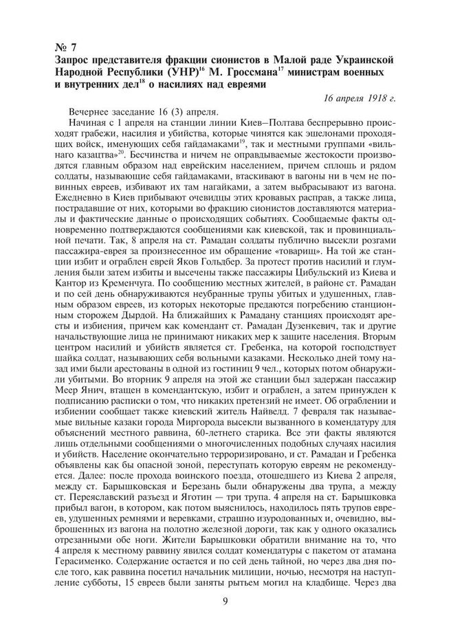 Запрос представителя фракции сионистов в Малой раде Украинской Народной Республики (УНР) М. Гроссмана министрам военных и внутренних дел о насилиях над евреями. 16 апреля 1918 г. // Киевская мысль. 1918. 18 (5) апреля.