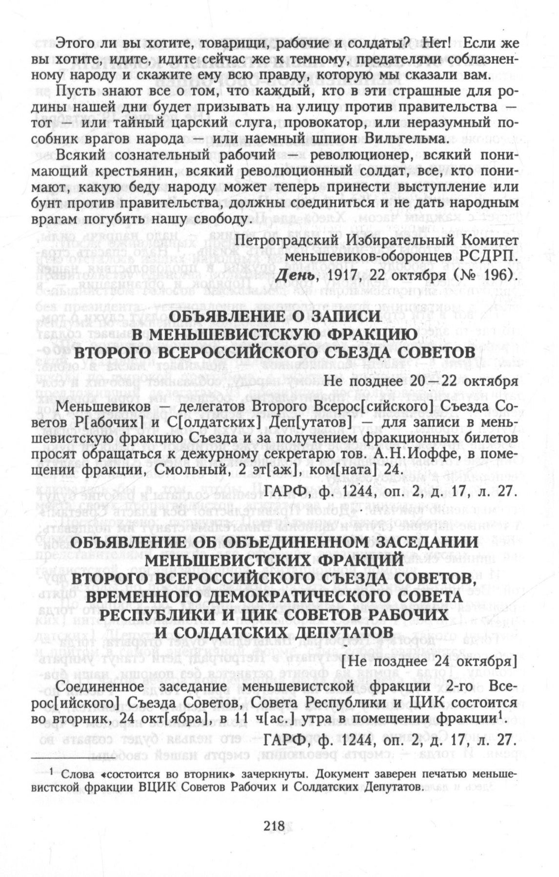 Главная Серия «Политические партии России. Конец XIX – первая треть ХХ века... Меньшевики в 1903—1931 гг. Меньшевики в 1917 году. В 3 т. Т. 3. От корниловского мятежа до кон... Документы Объявление об объединенном заседании меньшевистских фракций Второго...