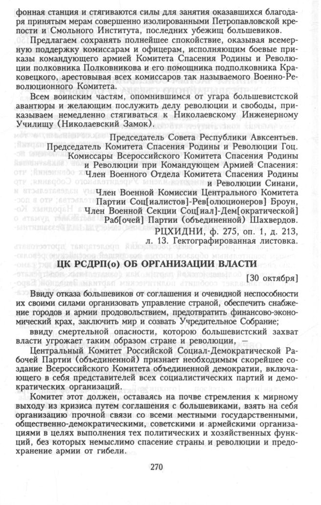 ЦК РСДРП(о) об организации власти. [30 октября] // РЦХИДНИ, ф. 275, oп. 1, д. 40, л. 8. Гектографированная листовка.