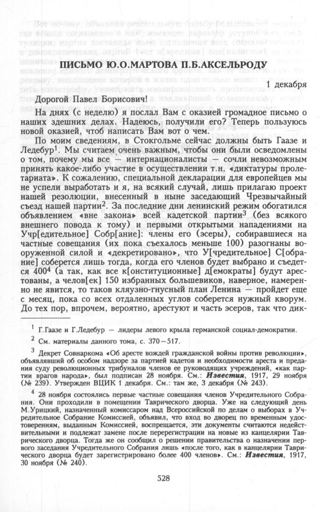 Письмо Ю.О.Мартова П.Б.Аксельроду. 1 декабря // Boris J. Nicolaevsky Collection, Hoover Institution Archives, Stanford, Series 17, Box 51, folders 1 (рукопись), 2 (машинописная копия).
