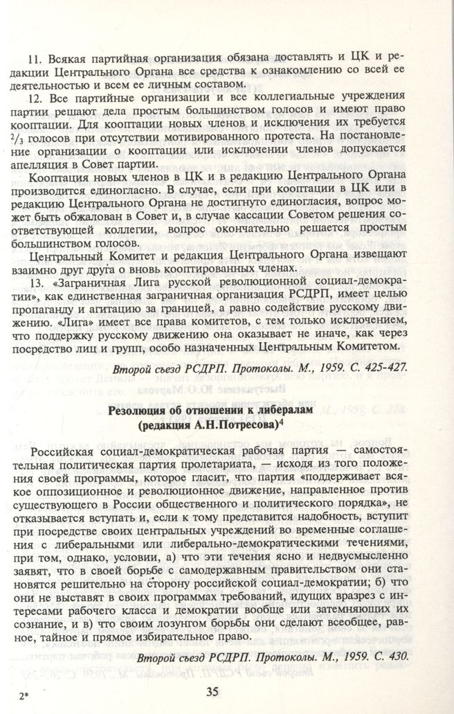Документы и материалы II съезда РСДРП. 17 июля — 10 августа (30 июля — 23 августа) 1903 г. Резолюция об отношении к либералам (редакция А.Н.Потресова // Второй съезд РСДРП. Протоколы. М., 1959. С. 430.