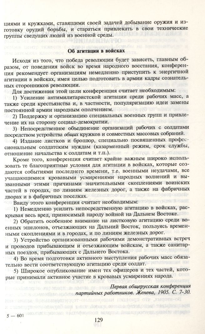 Документы Первой общерусской конференции партийных работников в Женеве. Конец апреля — начало мая 1905 г. Проекты резолюций, выработанные комиссией, но не рассмотренные на конференции за недостатком времени. Об агитации в войсках