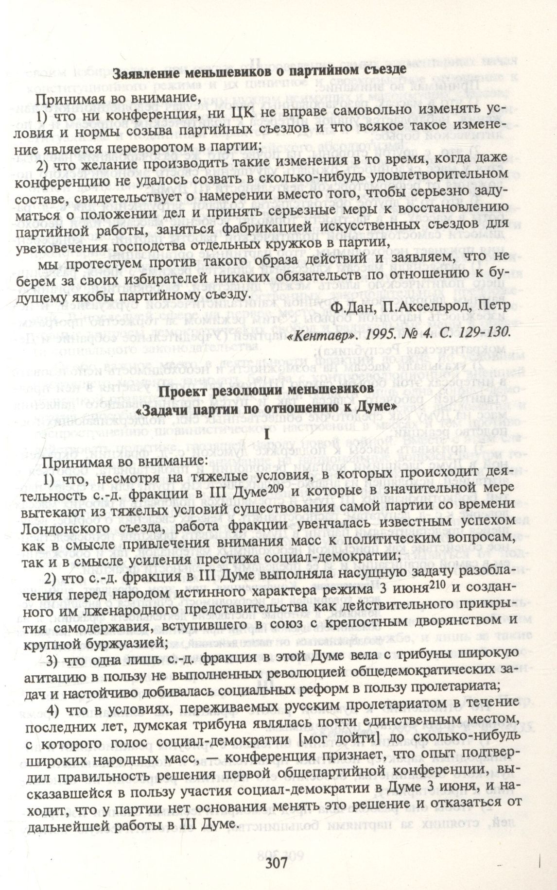 Из протоколов V Всероссийской конференции РСДРП. 21—27 декабря 1908 г. (3—9 января 1909 г.). Заявление меньшевиков о партийном съезде // «Кентавр», 1995. № 4. С. 129-130.