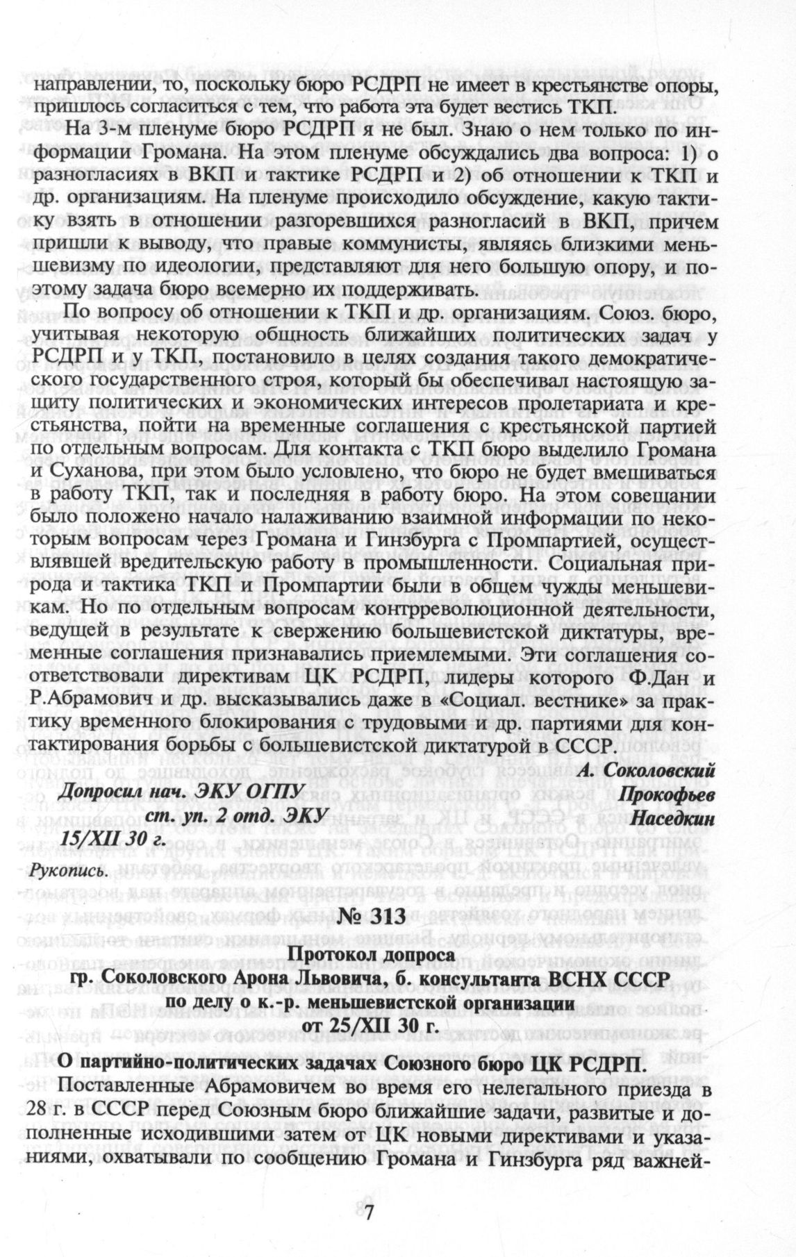 Соколовский Арон Львович. Протокол допроса гр. Соколовского Арона Львовича, б. консультанта ВСНХ СССР по делу о к.-р. меньшевистской организации от 25/ХІІ 30 г. // ЦА ФСБ РФ. Рукопись.