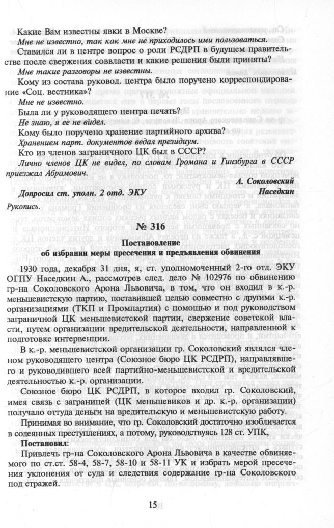 Главная Серия «Политические партии России. Конец XIX – первая треть ХХ века... Меньшевики в 1903—1931 гг. Меньшевистский процесс 1931 года. Сборник документов. В 2-х кн. Кн. 2 Документы Соколовский Арон Львович. Постановление об избрании меры пресечения...