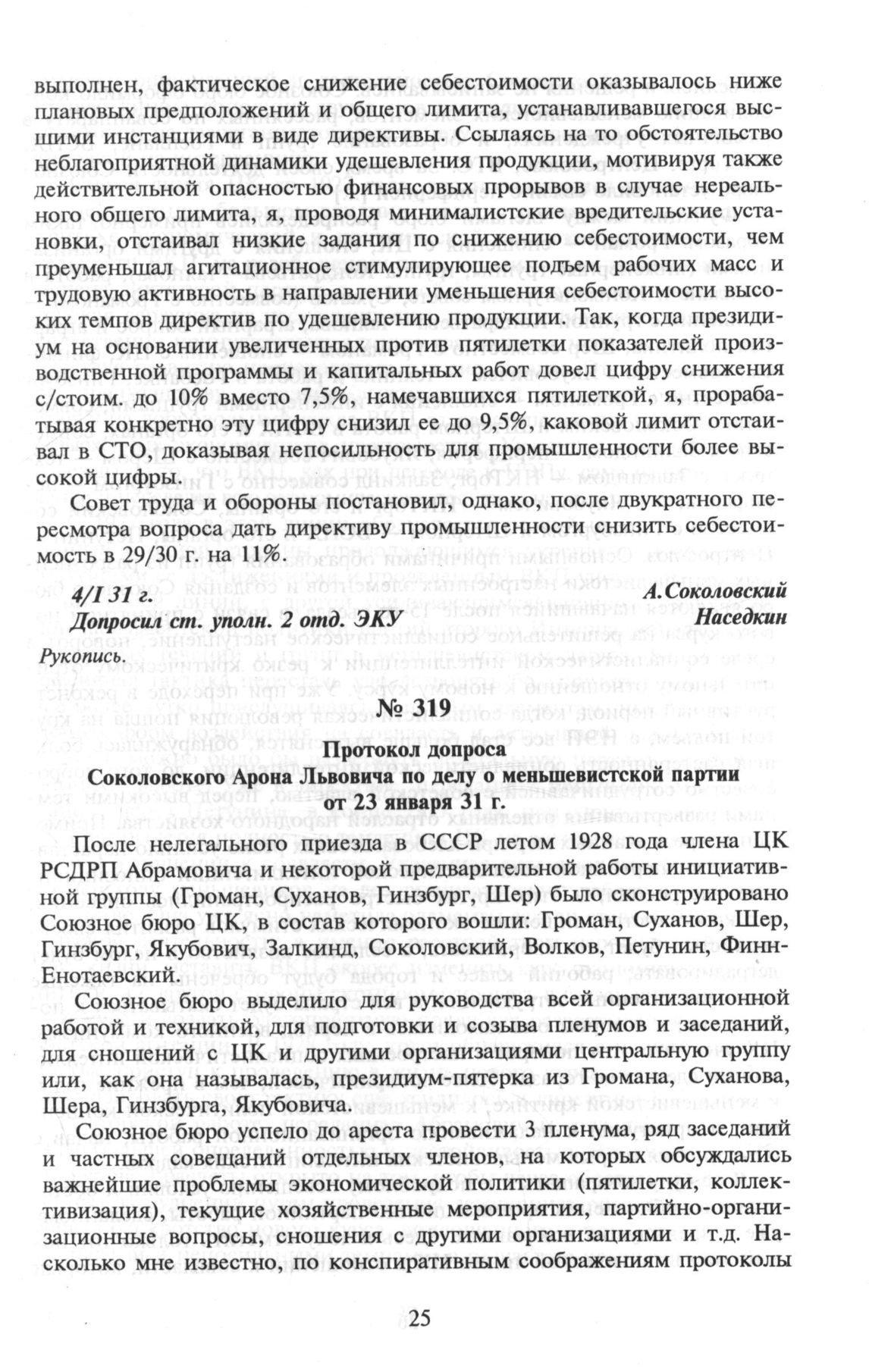 Соколовский Арон Львович. Протокол допроса Соколовского Арона Львовича по делу о меньшевистской партии от 23 января 31 г. // ЦА ФСБ РФ.