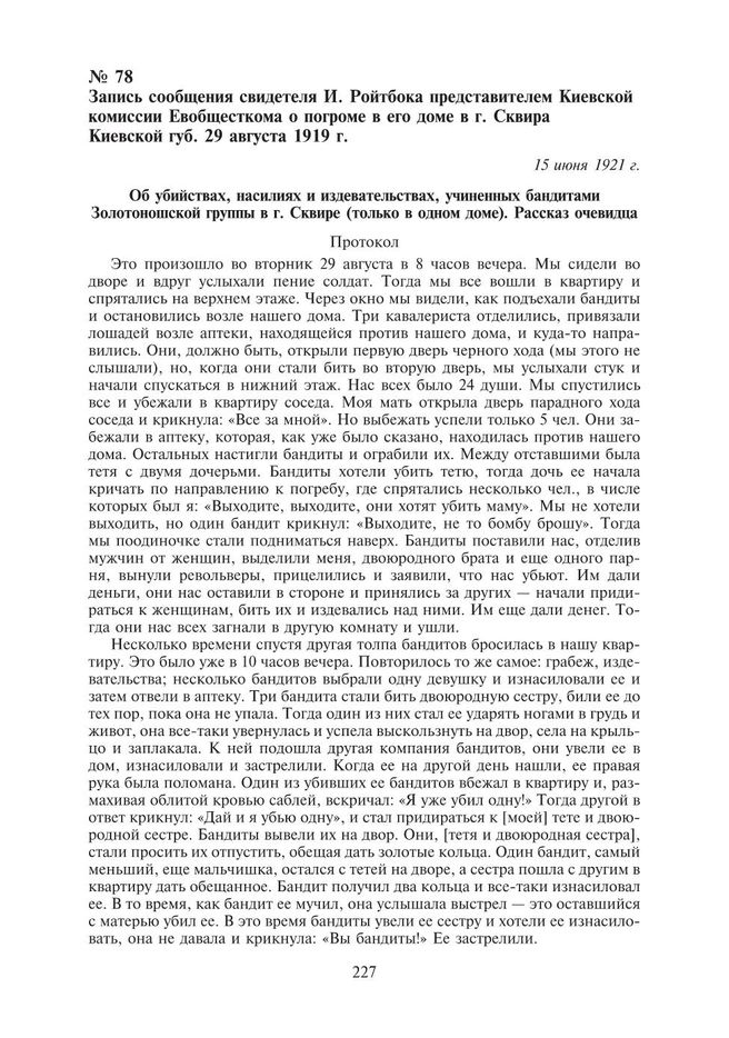 Запись сообщения свидетеля И. Ройтбока представителем Киевской комиссии Евобщесткома о погроме в его доме в г. Сквира Киевской губ. 29 августа 1919 г. 15 июня 1921 г. : Об убийствах, насилиях и издевательствах, учиненных бандитами Золотоношской группы в г. Сквире (только в одном доме). Рассказ очевидца // ГА РФ. Ф. Р-1339. Оп. 1. Д. 433. Л. 40–40 об. Копия.