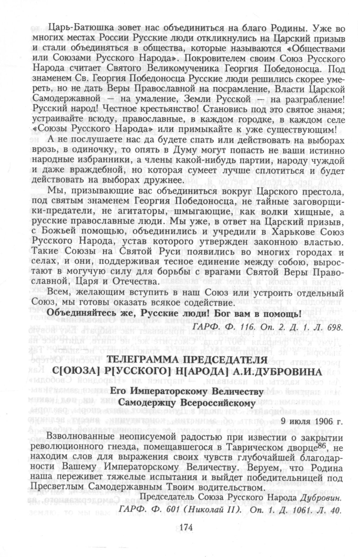 Телеграмма председателя С[оюза] р[усского] н[арода] А.И. Дубровина. 9 июля 1906 г. // ГАРФ. Ф. 601 (Николай II). Оп. 1. Д. 1061. Л. 40.