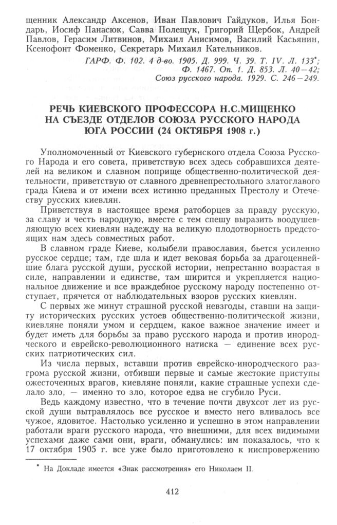Речь киевского профессора Н.С. Мищенко на съезде отделов Союза русского народа юга России (24 октября 1908 г.) // ГАРФ. Ф. 102. ДП ОО. 1905. Д. 999. Ч. 39. Т. IV. Л. 133; Союз русского народа. М., 1929. С. 242 — 244.