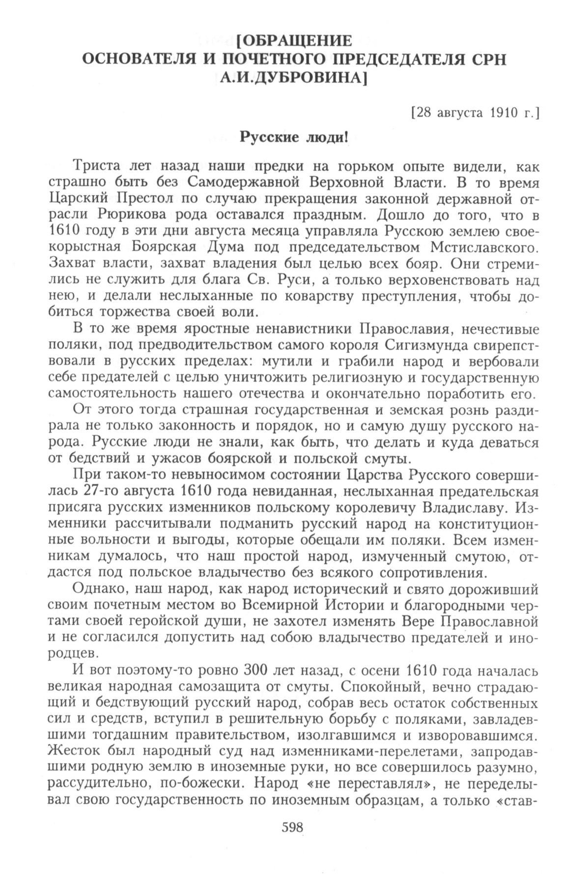 Главная Серия «Политические партии России. Конец XIX – первая треть ХХ века... Правые партии. 1905—1917 гг. Документы и материалы. В 2 т. Правые партии. 1905—1917 гг. Документы и материалы. В 2 т. Т. 1. 19... Документы [Обращение основателя и почетного председателя СРН А.И. Дубровина]....