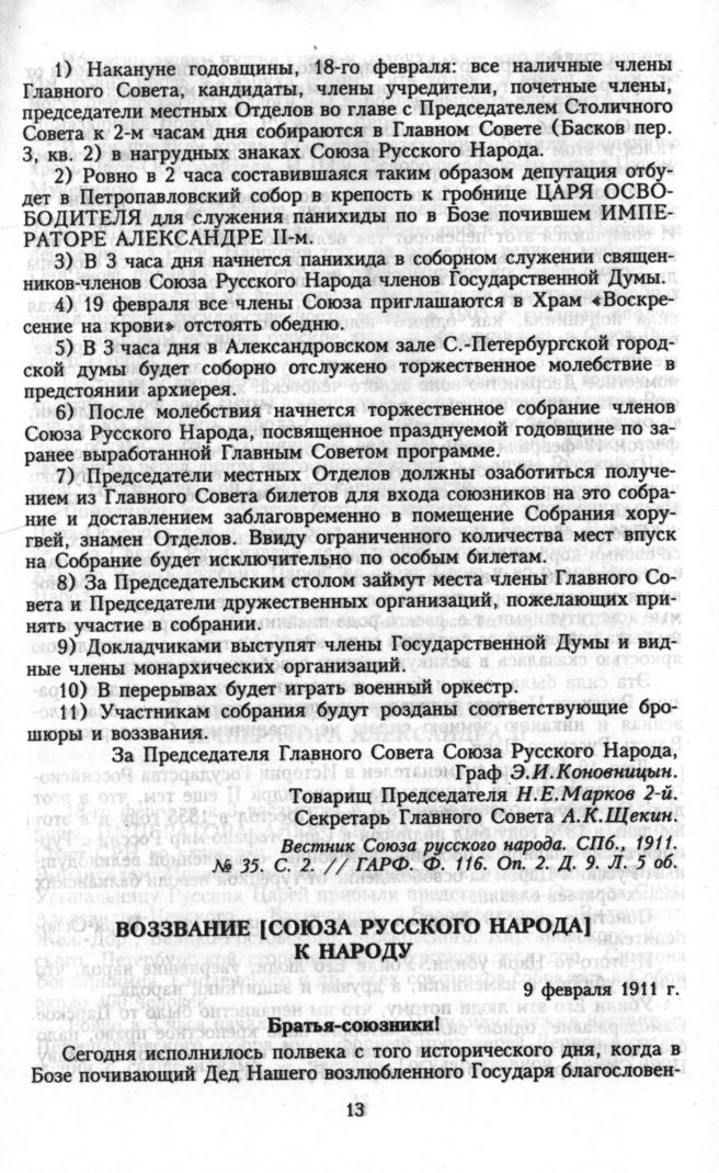 Воззвание [Союза русского народа] к народу 9 февраля 1911 г. // Вестник Союза русского народа. СПб., 1911. № 35. С. 3. ГАРФ. Ф. 116. Оп. 2. Д. 9. Л. 6.