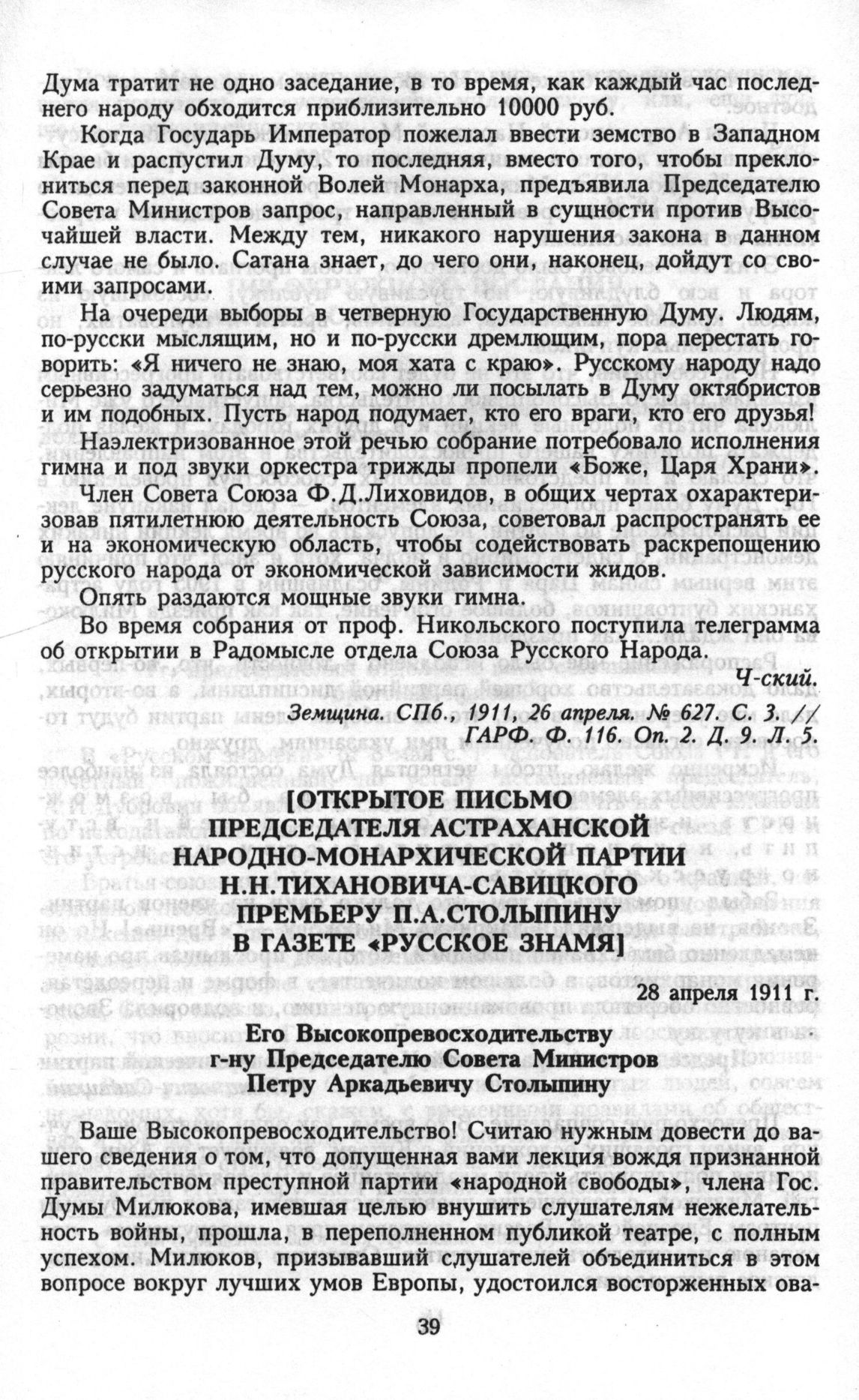 [Открытое письмо председателя Астраханской народно-монархической партии Н.Н.Тихановича-Савицкого премьеру П.А.Столыпину в газете «Русское Знамя»] 28 апреля 1911 г.