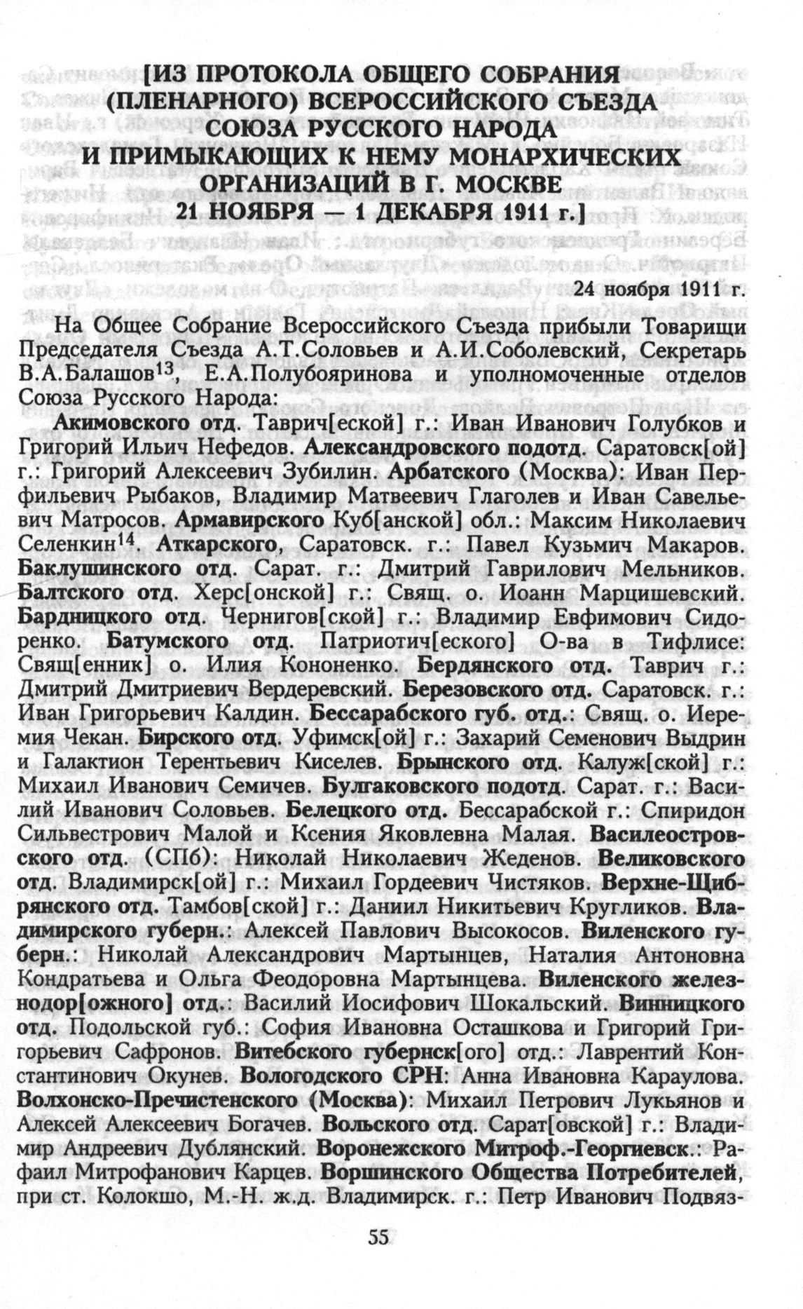 Из протокола общего собрания (пленарного) всероссийского съезда Cоюза русского народа и примыкающих к нему монархических организаций в г. Москве 21 ноября - 1 декабря 1911 г. 24 ноября 1911 г. // ГАРФ. Ф. 116. Оп. 2. Д. 1. Л. 86 - 93.