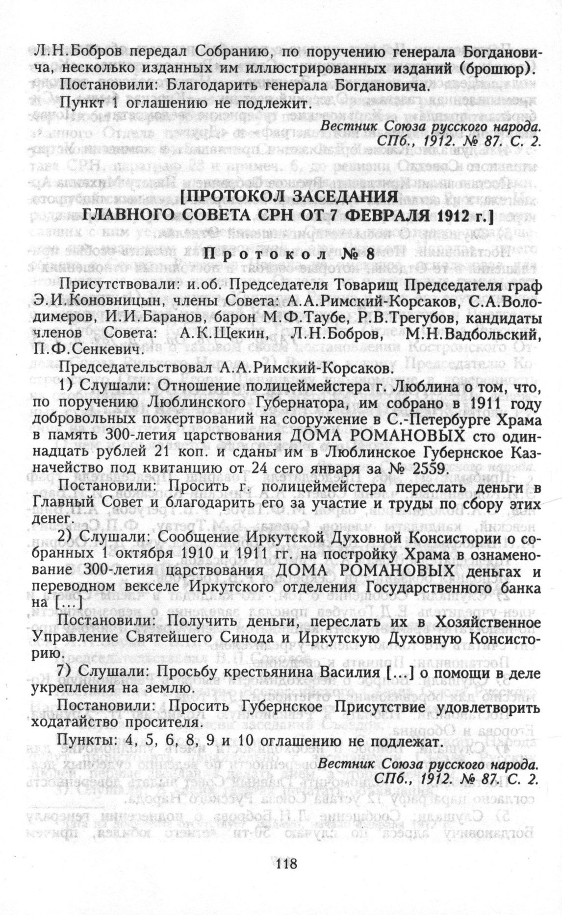 [Протокол заседания Главного совета СРН от 7 февраля 1912 г.] // Вестник Союза русского народа. СПб., 1912. № 87. С. 2.