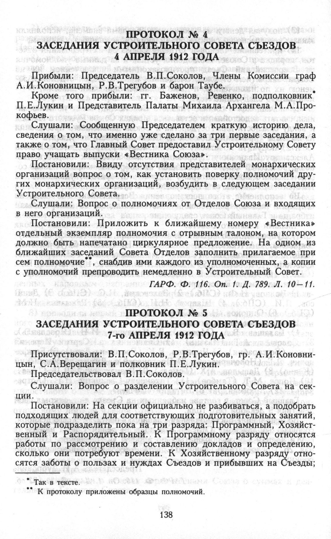 Протокол № 4 заседания устроительного совета съездов 4 апреля 1912 года // ГАРФ. Ф. 116. Оп. 1. Д. 789. Л. 10 - 11.