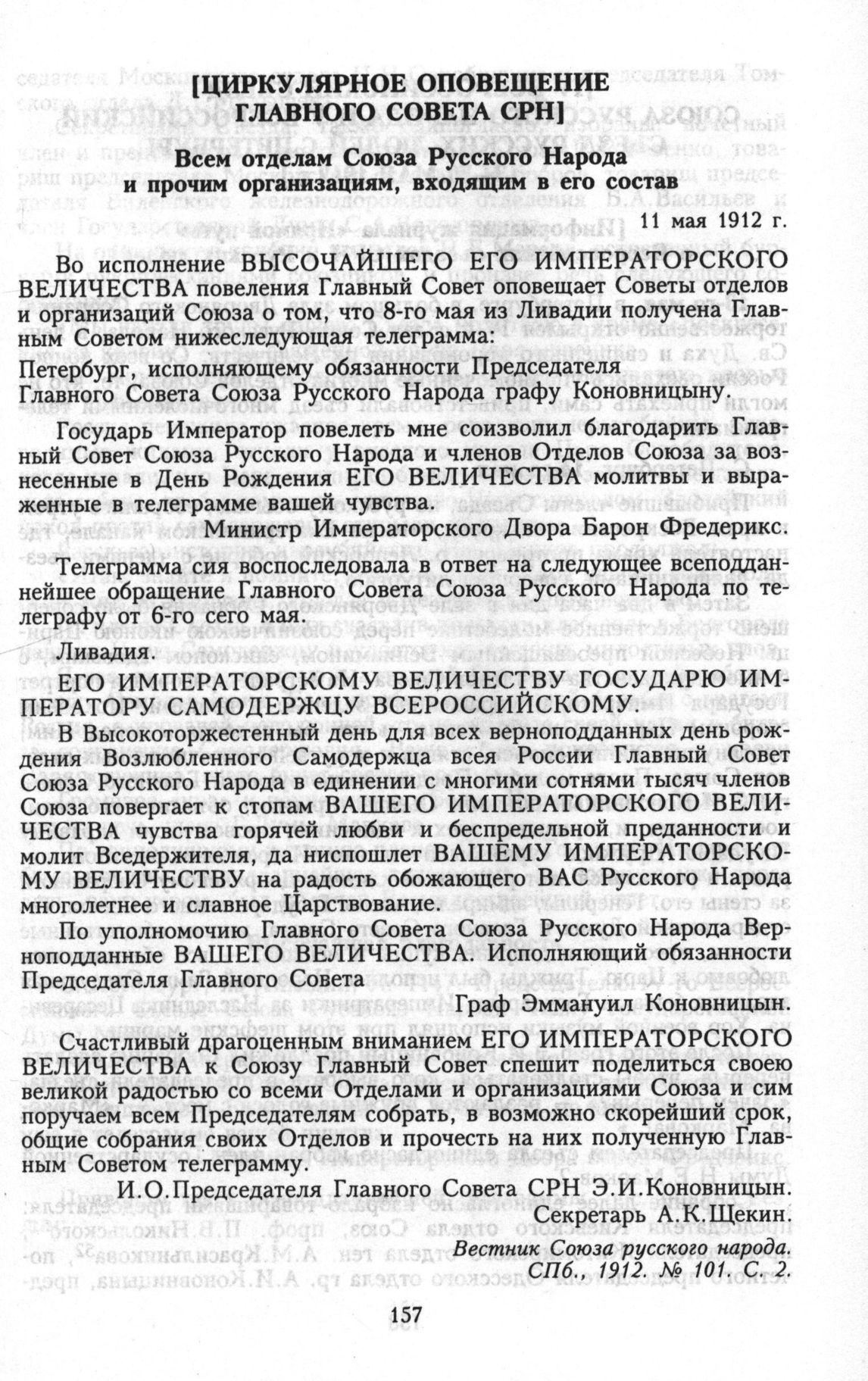 [Циркулярное оповещение Главного совета СРН] 11 мая 1912 г. // Вестник Союза русского народа. СПб., 1912. № 101. С. 2.