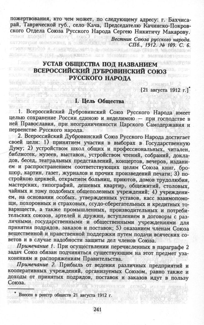 Устав общества под названием всероссийский Дубровинский Союз русского народа [21 августа 1912 г.] // Устав общества под названием Всероссийский Дубровинский Союз русского народа. СПб., 1912. С. 3 - 15. ГАРФ. Ф. 116. Оп. 2. Д. 1. Л. 19 - 26.