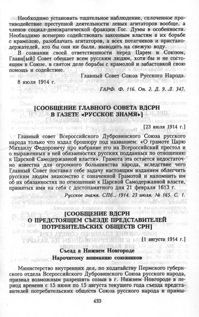 [Сообщение ВДСРН о предстоящем съезде представителей потребительских обществ СРН] [1 августа 1914 г.] // Русское Знамя. СПб., 1914. 1 августа . С. 1.