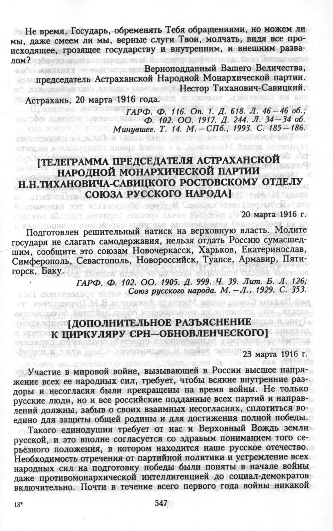 [Дополнительное разъяснение к циркуляру СРН-обновленческого] 23 марта 1916 г. // ГАРФ. Ф. 117. Оп. 1. Д. 282. Л. 1 - 1 об.; Ф. 102. 4 д-во. 1915. Д. 110. Л. 191.