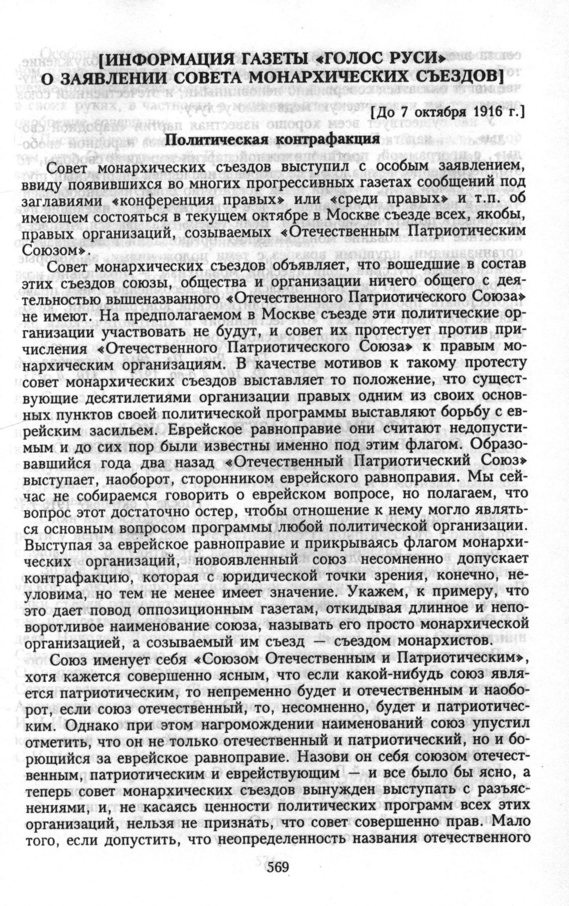 [Информация газеты «Голос Руси» о заявлении совета монархических съездов] [до 7 октября 1916 г.] // Голос Руси. Пг., 1916. 8 октября. ГАРФ. Ф. 102. 4 д-во. 1915. Д. 110. Л. 255.