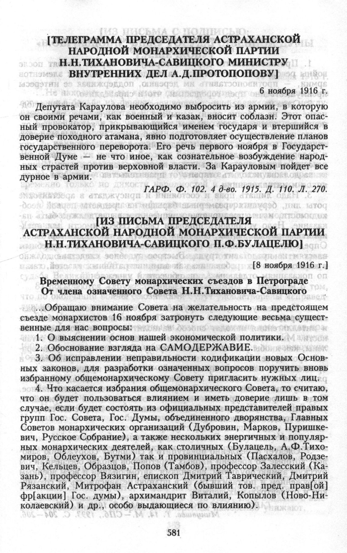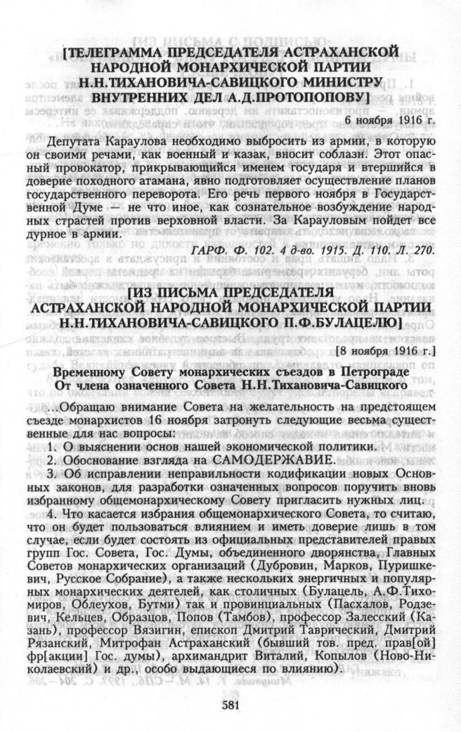 [Из письма председателя Астраханской Народной Монархической Партии Н.Н. Тихановича-Савицкого П.Ф. Булацелю] [8 ноября 1916 г.] // ГАРФ. Ф. 102. ОО. Оп. 265. 1916. Д. 1059. Л. 976а - 976б.; Минувшее. Т. 14. М.-СПб., 1993. С. 204 - 206.
