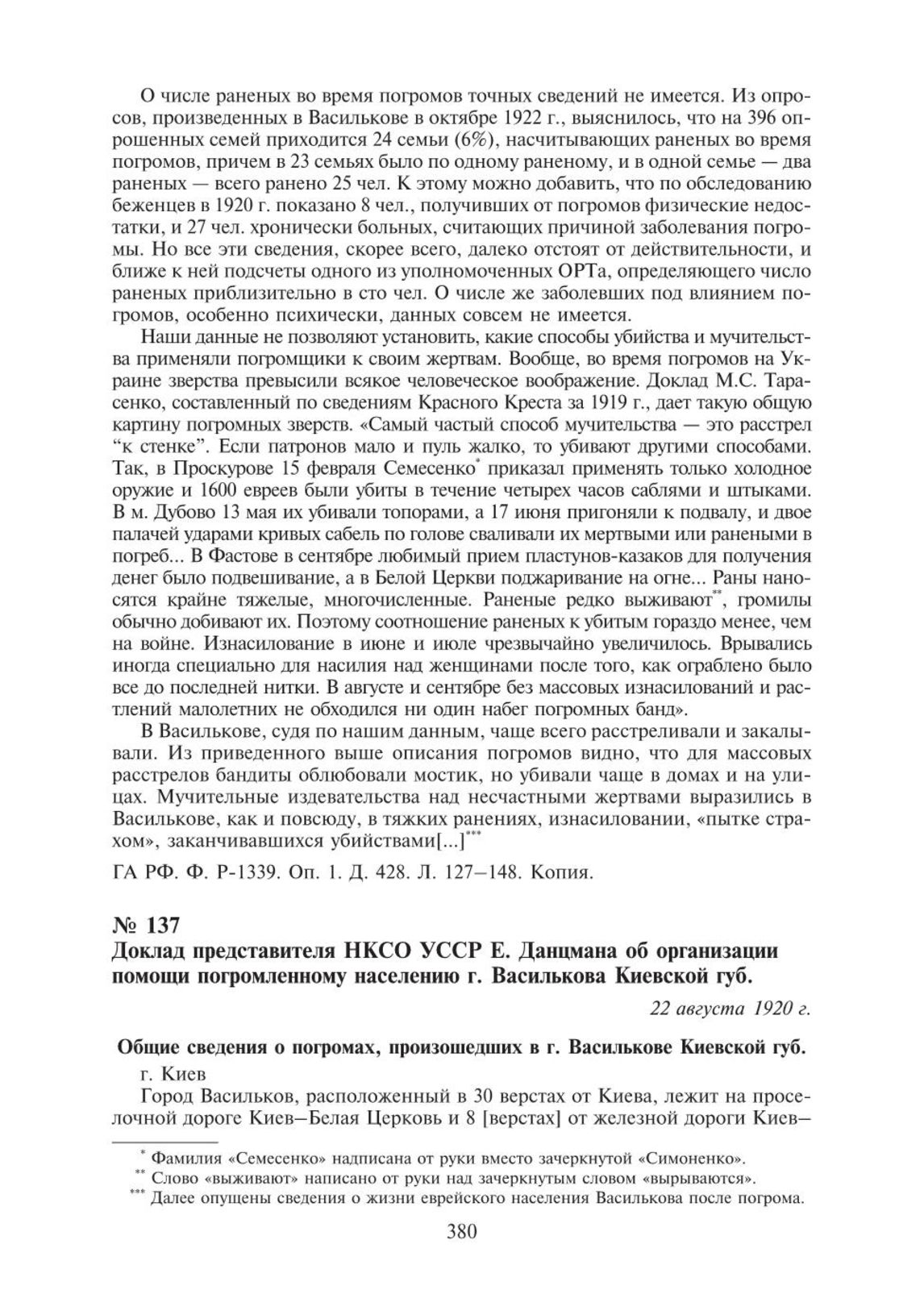 Доклад представителя НКСО УССР Е. Данцмана об организации помощи погромленному населению г. Василькова Киевской губ. 22 августа 1920 г. : Общие сведения о погромах, произошедших в г. Василькове Киевской губ. // ГА РФ. Ф. Р-1339. Оп. 1. Д. 423. Л. 125–126. Копия.