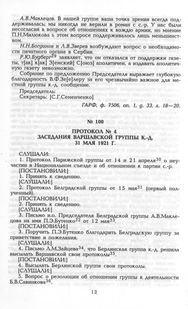 Главная Серия «Политические партии России. Конец XIX – первая треть ХХ века... Конституционно-демократическая партия Протоколы Центрального Комитета и заграничных групп конституционно-... Протоколы Центрального Комитета и заграничных групп конституционно-... Документы Протокол № 4 заседания Варшавской группы к.-д. 31 мая 1921 г.