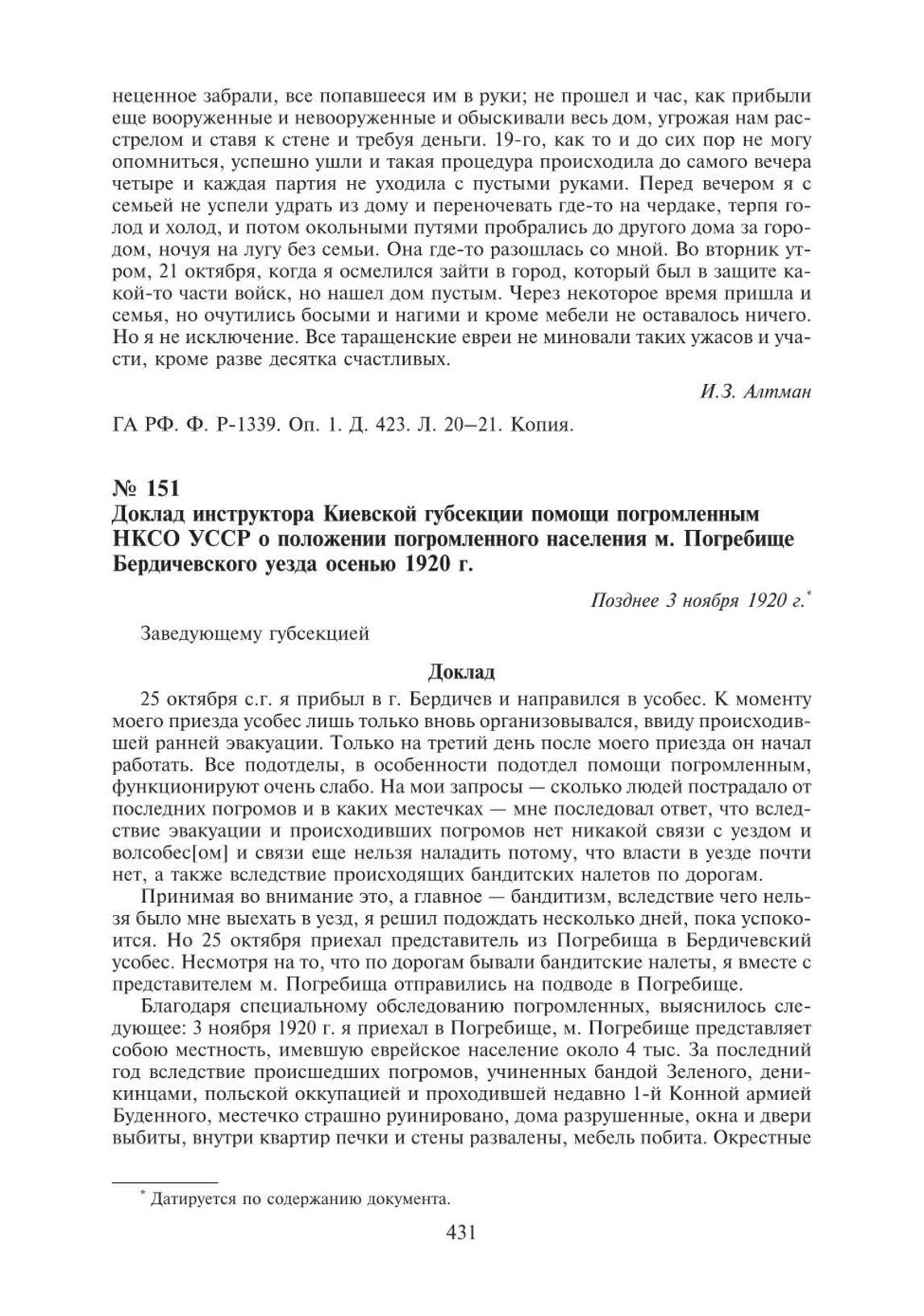 Доклад инструктора Киевской губсекции помощи погромленным НКСО УССР о положении погромленного населения м. Погребище Бердичевского уезда осенью 1920 г. Позднее 3 ноября 1920 г. // ГА РФ. Ф. Р-1339. Оп. 1. Д. 427. Л. 13. Копия.