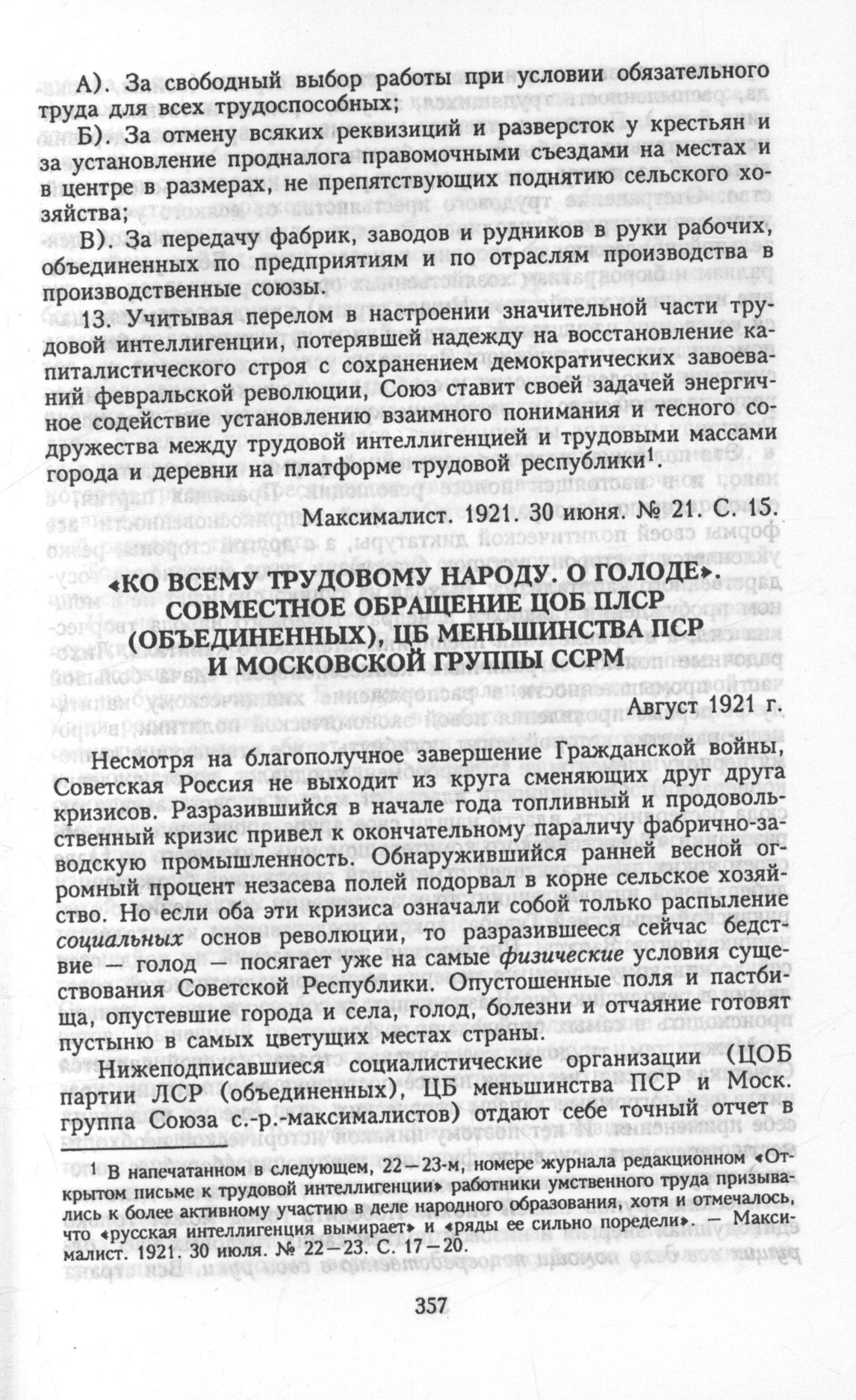 «Ко всему трудовому народу. О голоде». Совместное обращение ЦОБ ПЛСР (объединенных), ЦБ меньшинства ПСР и Московской группы ССРМ. Август 1921 г. // Знамя. 1921. Сентябрь. № 10 (12). С. 59—60.