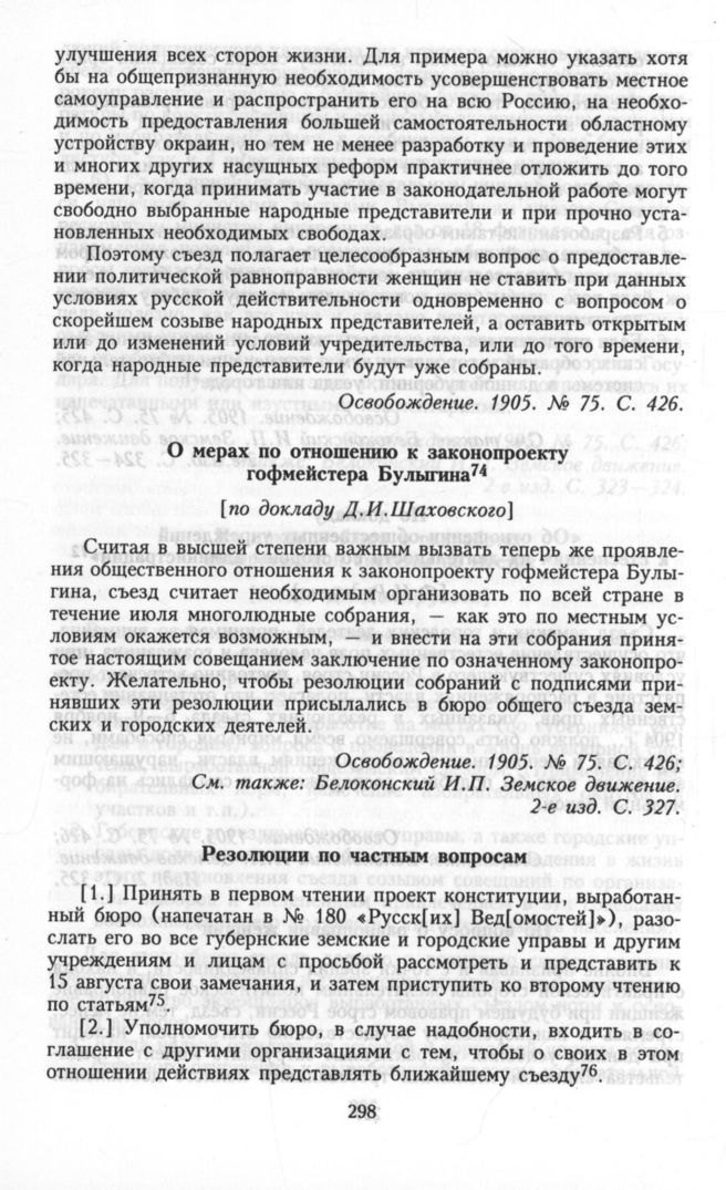 Общероссийский съезд земско-городских деятелей 6-8 июля 1905 года. Москва. Постановления и резолюции съезда. Резолюции по частным вопросам // Освобождение. 1905. № 75. С. 426-427.