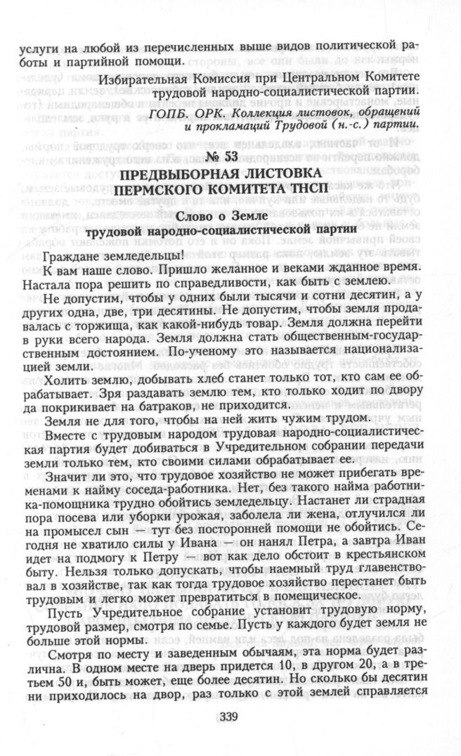 Предвыборная листовка Пермского комитета ТНСП // ГОПБ. ОРК. Коллекция листовок, обращений и прокламаций Трудовой (н.-с.) партии.