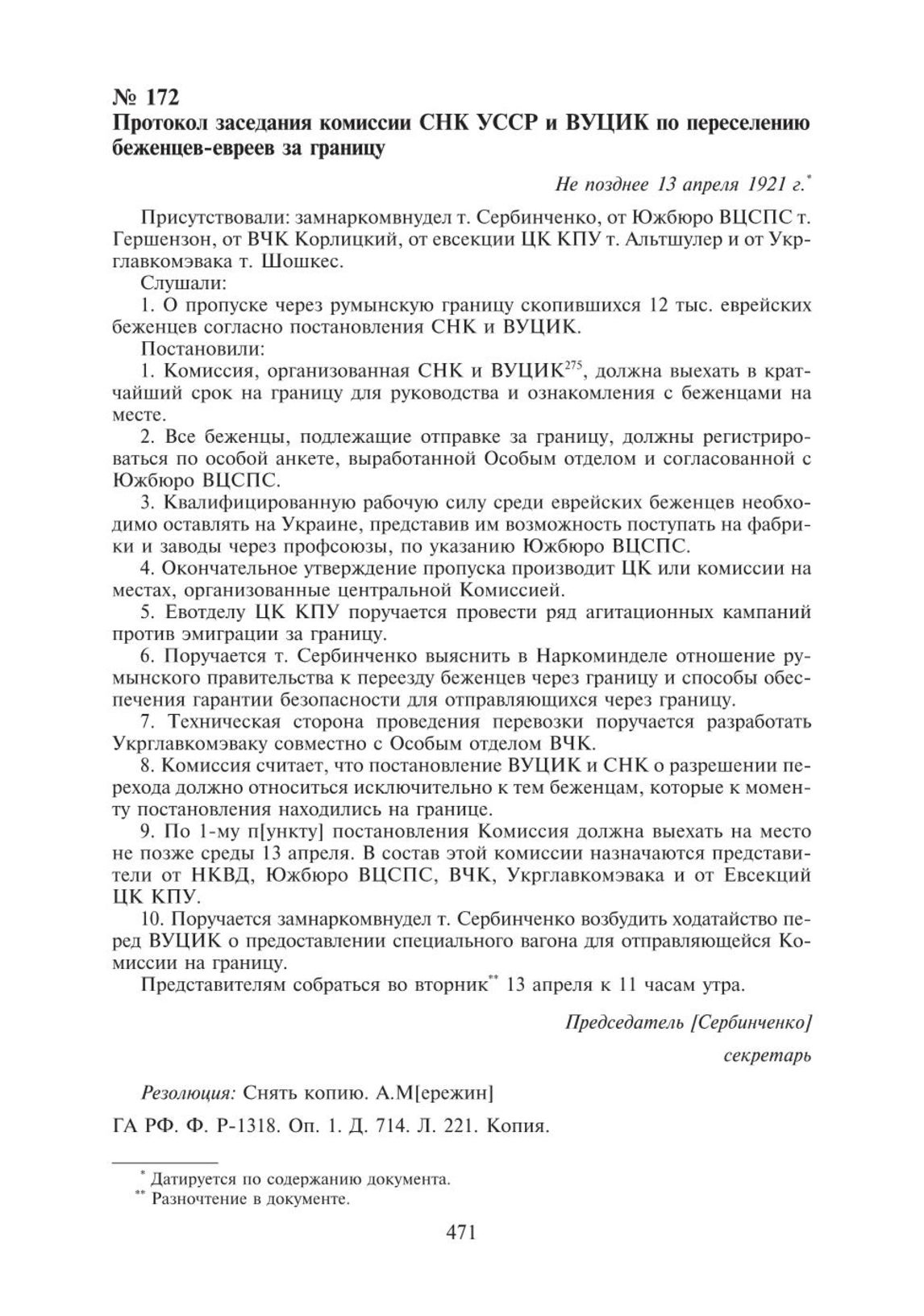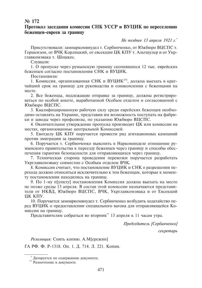 Протокол заседания комиссии СНК УССР и ВУЦИК по переселению беженцев-евреев за границу. Не позднее 13 апреля 1921 г. // ГА РФ. Ф. Р-1318. Оп. 1. Д. 714. Л. 221. Копия.