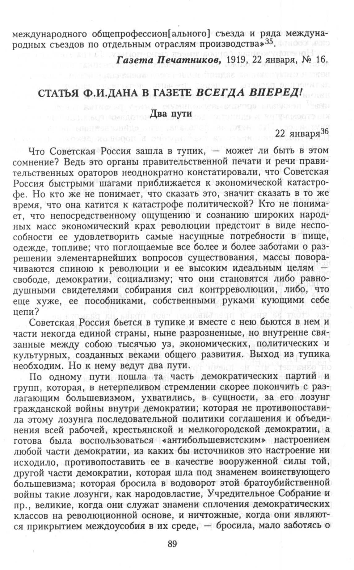 Главная Серия «Политические партии России. Конец XIX – первая треть ХХ века... Меньшевики в 1903—1931 гг. Меньшевики в большевистской России. 1918—1924. Меньшевики в 1919—19... Документы Статья Ф.И.Дана в газете Всегда Вперед! Два пути. 22 января