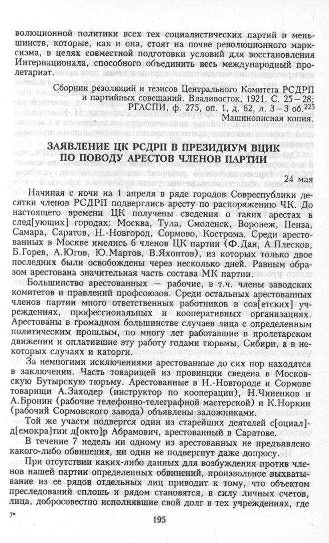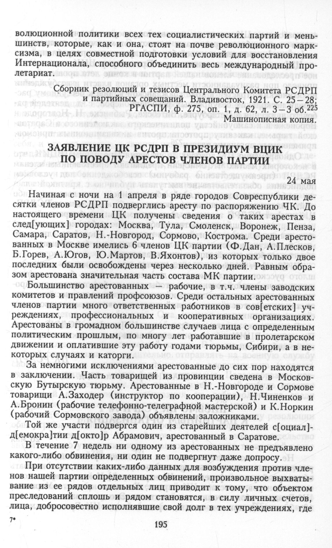 Главная Серия «Политические партии России. Конец XIX – первая треть ХХ века... Меньшевики в 1903—1931 гг. Меньшевики в большевистской России. 1918—1924. Меньшевики в 1919—19... Документы Заявление ЦК РСДРП в Президиум ВЦИК по поводу арестов членов партии...