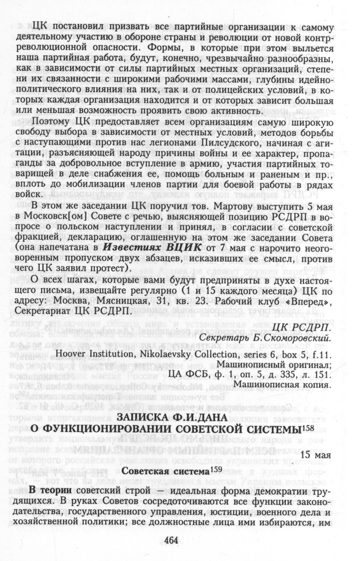 Главная Серия «Политические партии России. Конец XIX – первая треть ХХ века... Меньшевики в 1903—1931 гг. Меньшевики в большевистской России. 1918—1924. Меньшевики в 1919—19... Документы Записка Ф.И.Дана о функционировании советской системы. 15 мая