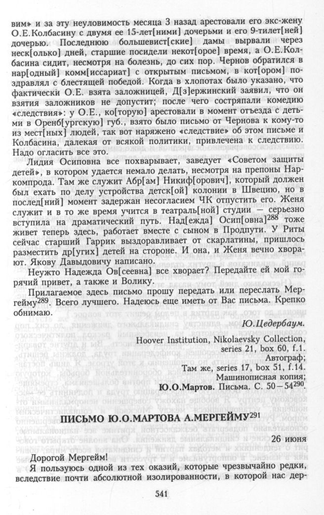 Письмо Ю.О.Мартова А.Мергейму. 26 июня // Hoover Institution, Nikolaevsky Collection, series 17, box 51, f. 10. Рукописная копия.; Там же, f. 14. Машинописная копия.
