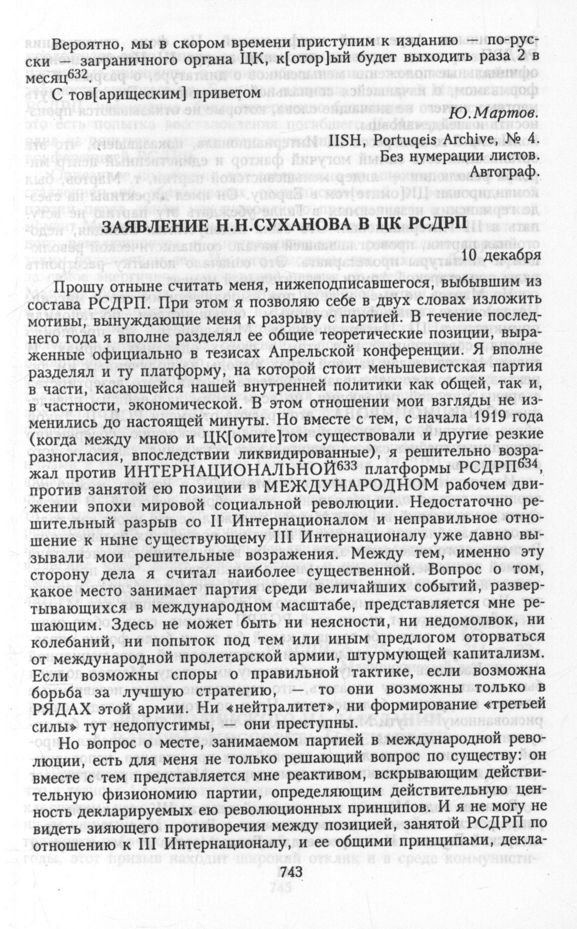 Заявление Н.Н.Суханова в ЦК РСДРП. 10 декабря // РГАСПИ, ф. 275, oп. 1, д. 214, л. 23. Машинописный подлинник.