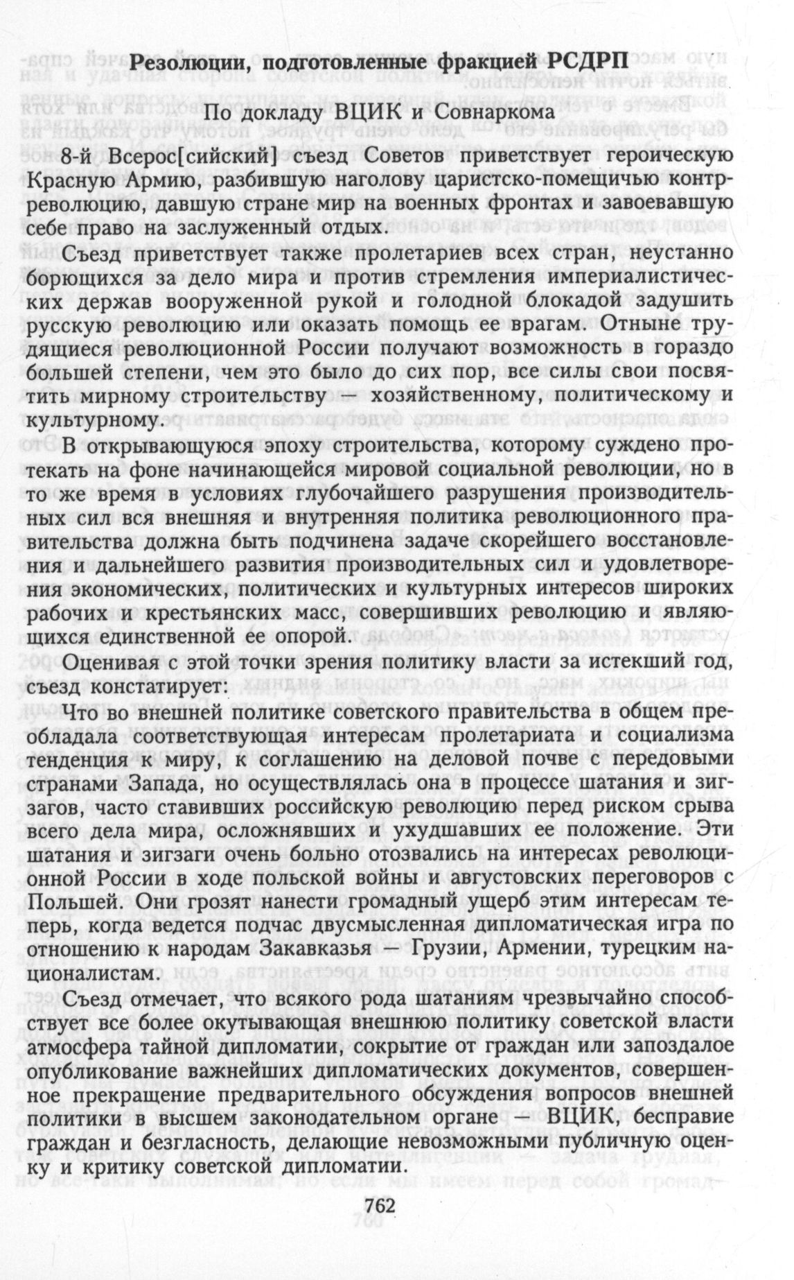 Из материалов VIII Всероссийского съезда Советов. Москва, 22 — 29 декабря. Резолюции, подготовленные фракцией РСДРП. По докладу ВЦИК и Совнаркома