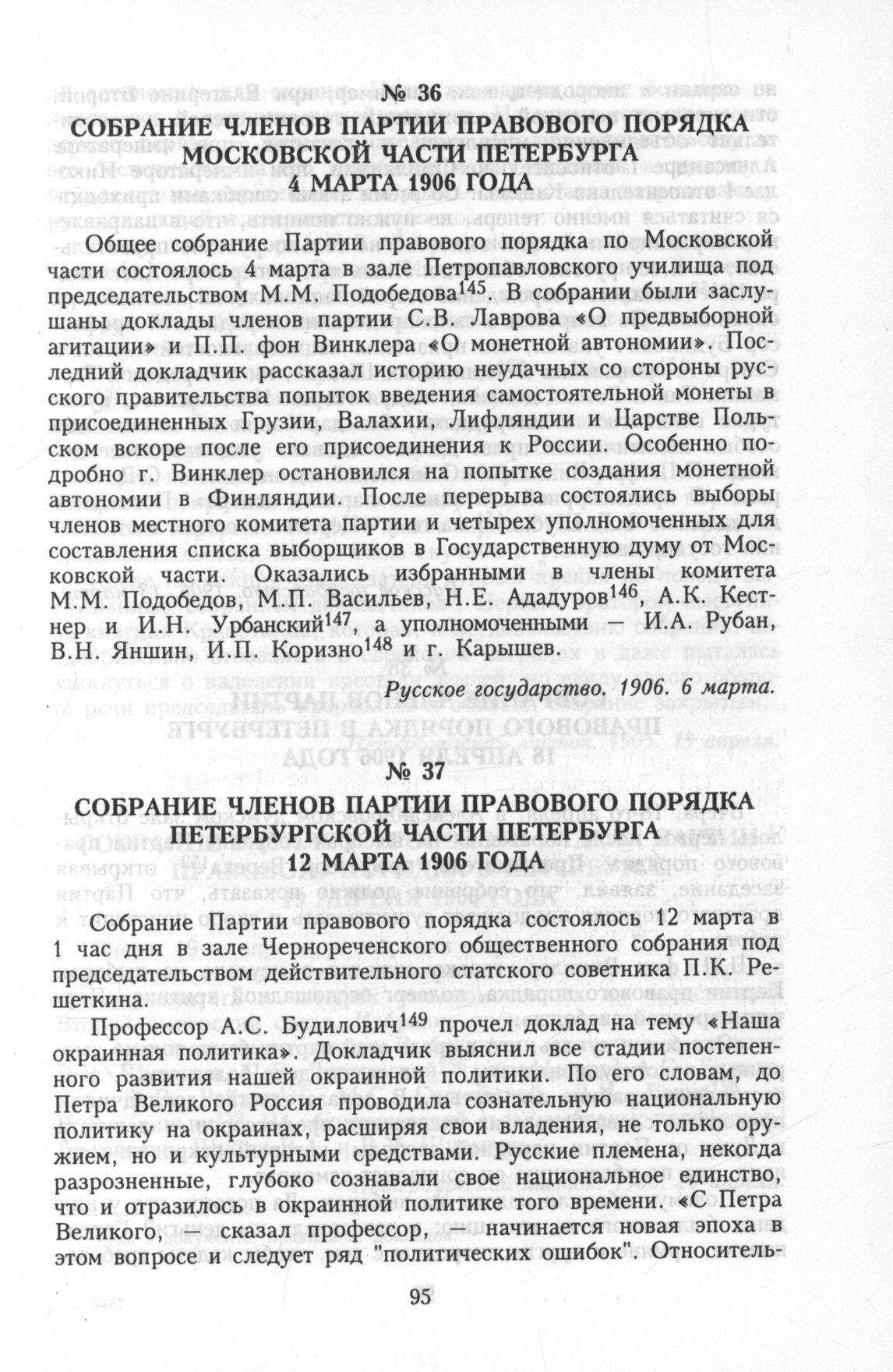 Собрание членов Партии правового порядка Московской части Петербурга 4 марта 1906 года // Русское государство. 1906. 6 марта.