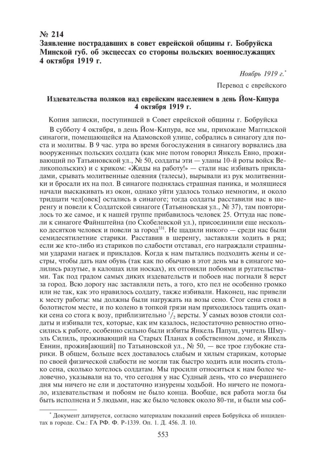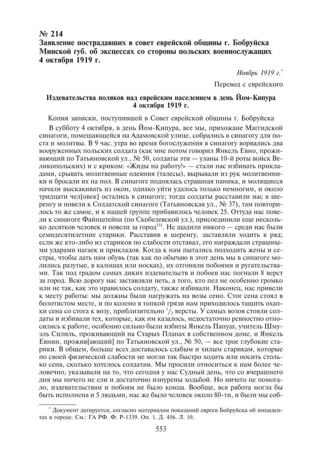 Заявление пострадавших в совет еврейской общины г. Бобруйска Минской губ. об эксцессах со стороны польских военнослужащих 4 октября 1919 г. Ноябрь 1919 г. : Издевательства поляков над еврейским населением в день Йом-Кипура 4 октября 1919 г. // ГА РФ. Ф. Р-1339. Оп. 1. Д. 456. Л. 7. Заверенная копия // Материалы об антиеврейских погромах. Серия 1. Погромы в Белоруссии. Вып. 1. Погромы, учиненные белополяками. М., 1922. С. 53–54.